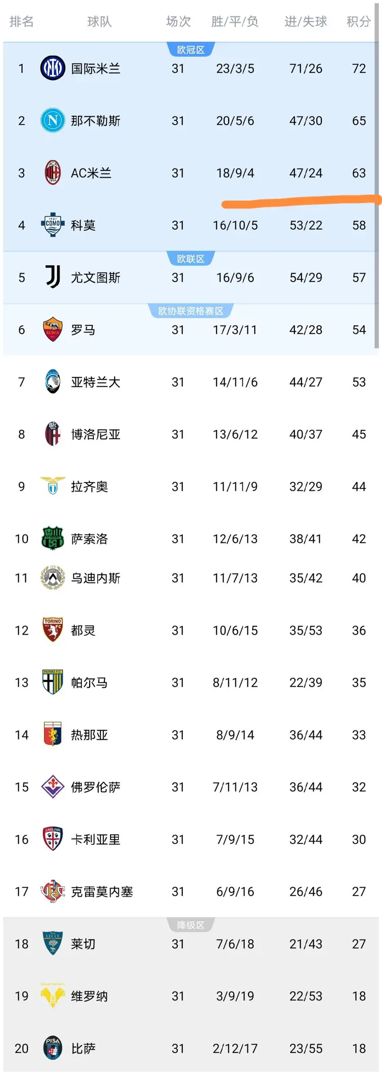 至此意甲积分榜发生变化:AC米兰输球后,积分停留在63分,被那不勒斯反超。此外争四白热化!