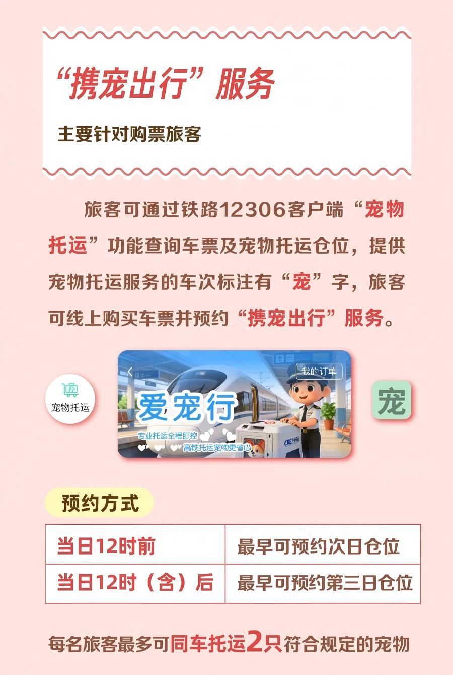 其中,“携宠出行”服务主要针对购票旅客,旅客可通过铁路12306客户端“宠物托运”功能查询车票及宠物托运仓位,提供宠物托运服务的车次标注有“宠”字,旅客可线上购买车票并预约同车宠物托运服务,每日12时前最早可预约次日仓位,12时(含)后最早可预约第三日仓位,每名旅客最多可同车托运2只符合规定的宠物。