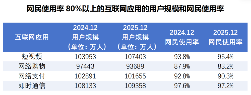 报告显示,截至2025年12月,在网民使用率80%以上的主要网络应用中,网络支付、网络购物、即时通信等应用的用户规模或使用率均有下降,短视频是唯一一个用户规模和使用率“双增长”的细分应用。