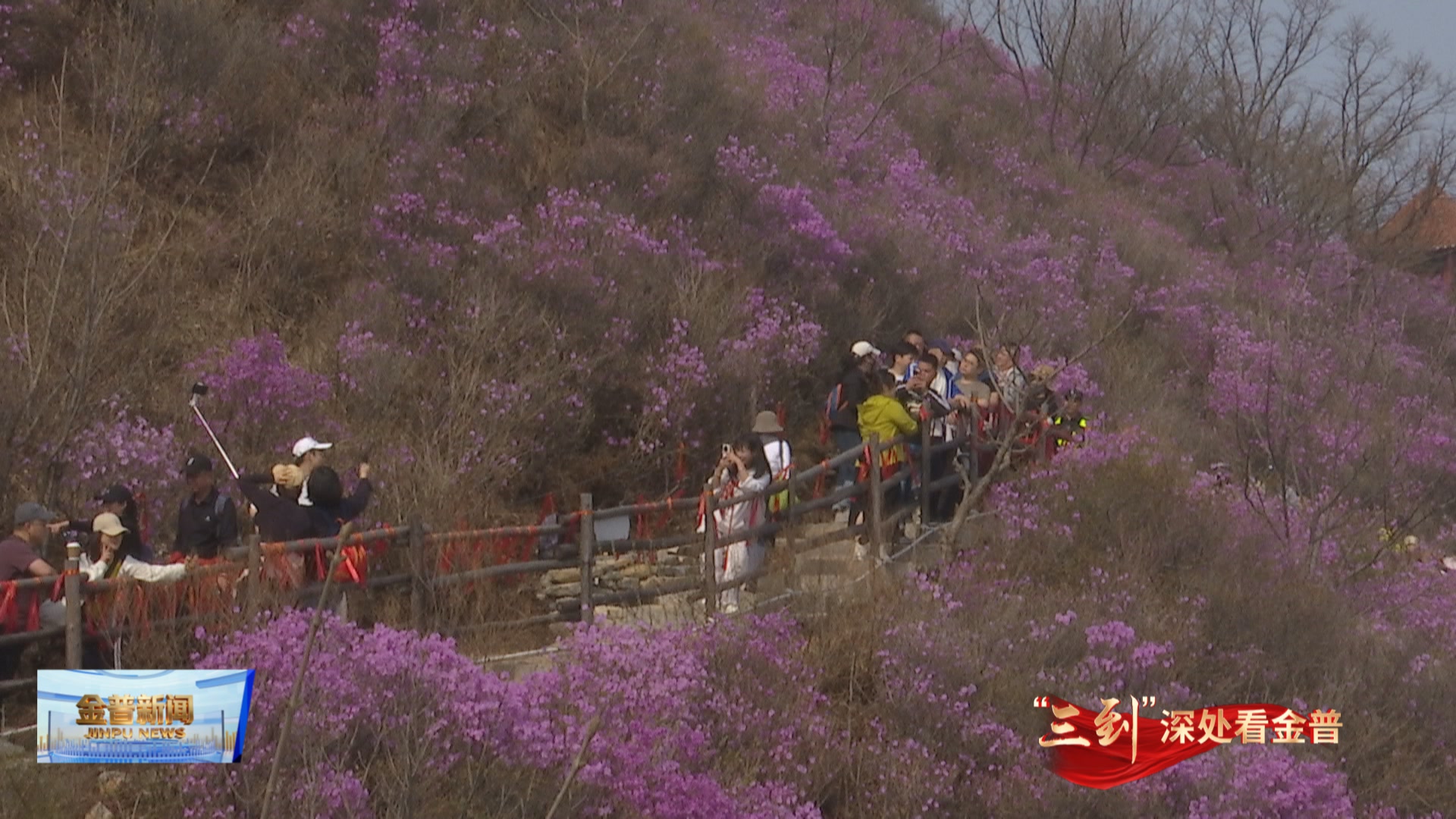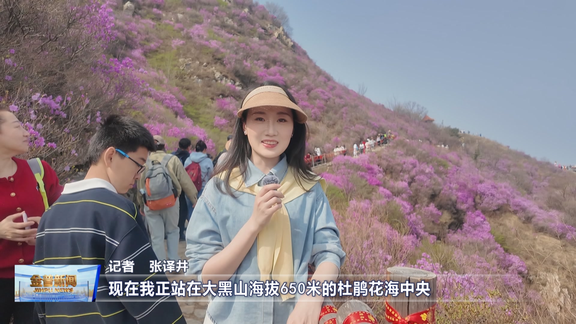 记者张译井(观众朋友们,大家好,现在我正站在大黑山海拔650米的杜鹃花海中央,大家看我身后,是不是像是走进了仙境?眼下正值杜鹃花的盛花期,这片百亩野生杜鹃花海,正迎着春日阳光竞相绽放。随着早春杜鹃的一花独放,大黑山也迎来了最浪漫季节。)