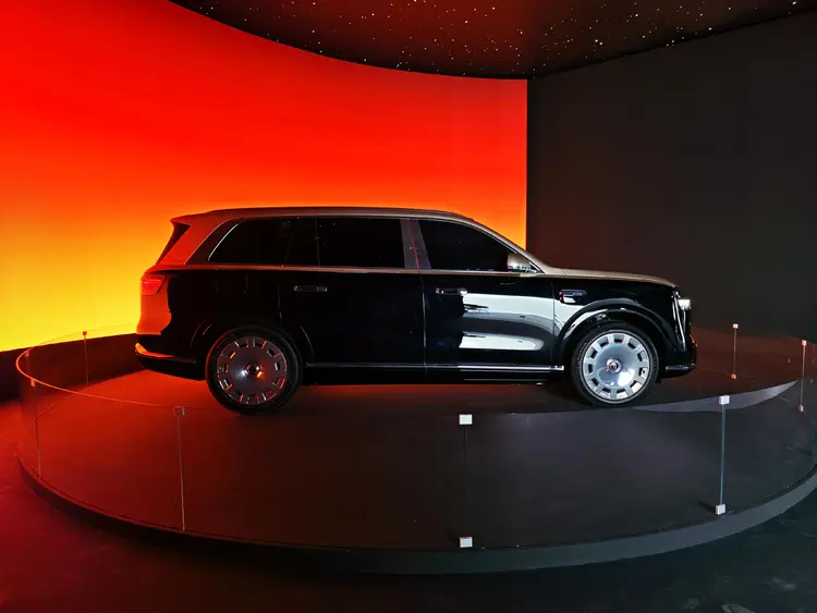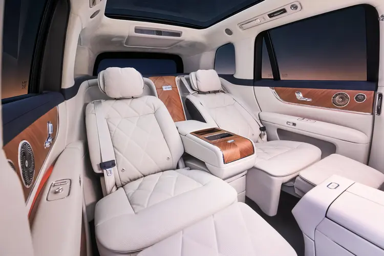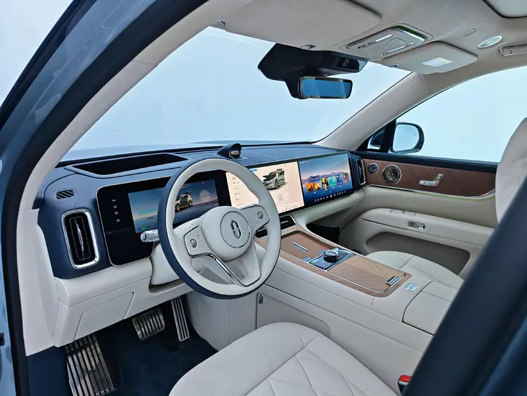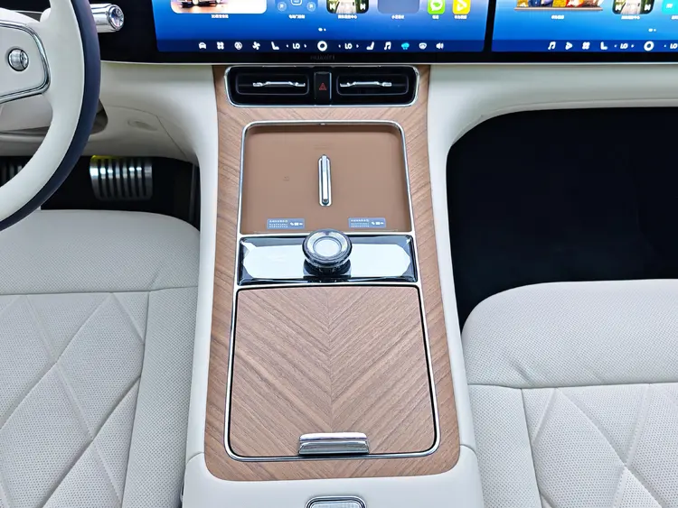 座舱内部,新车严格遵循中正对称的设计秩序,提供赤茶橘、韶华杏、松露棕、望月白、枫影红5种内饰配色。车内大面积采用Nappa真皮、实木材质以及水晶与真金属饰件,并全新引入了星寰岛动态旋转设计。