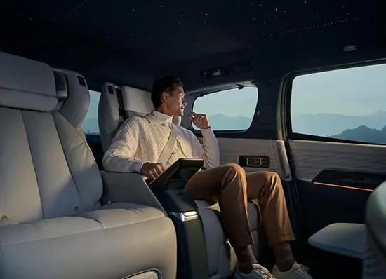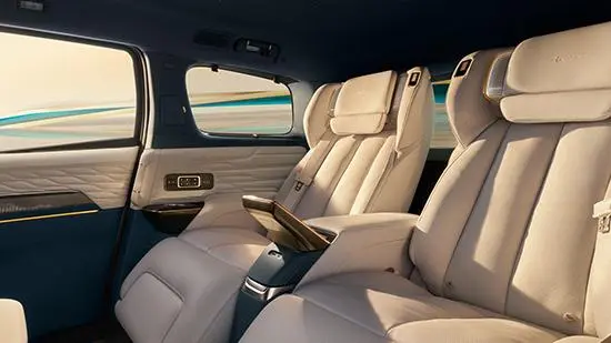 内饰部分,新车配备30英寸6K贯穿式一体化大屏,搭配四辐式多功能方向盘与电子怀挡机构,中控台采用双区域分层设计。配置上,四座版配备32英寸可升降智能屏、府邸级私享隔断系统与二排扶手控制屏,可操控座椅调节、智慧幕墙等多项功能;高端座椅支持22点分区按摩和石墨烯远红外理疗功能。
