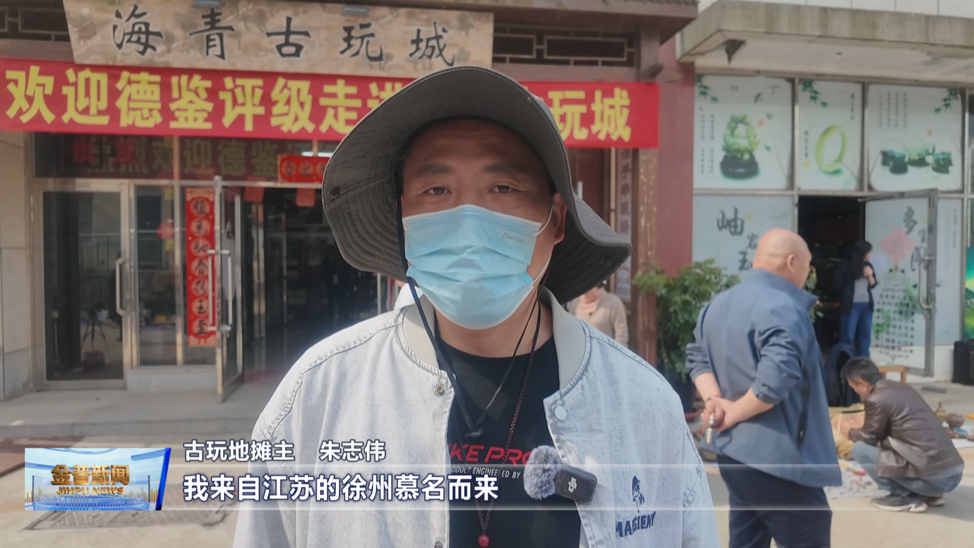古玩地摊主朱志伟(我来自江苏的徐州慕名而来,通过我们宣传的平台,来到我们海青古玩城,来到我们这个大集上,是想多参展这个展会,多卖一些东西。)