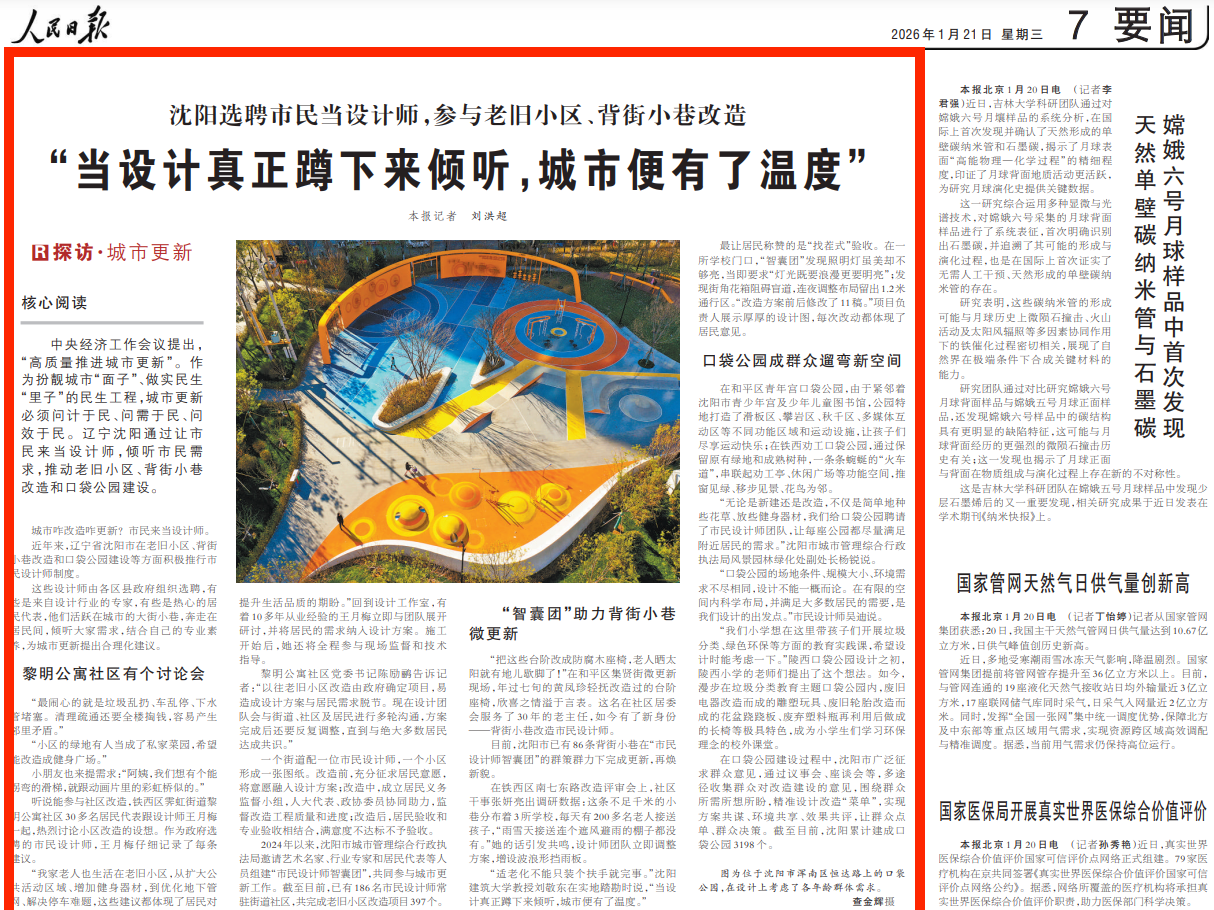 人民日报点赞沈阳选聘市民当设计师,参与老旧小区、背街小巷改造:“当设计真正蹲下来倾听,城市便有了温度”(探访·城市更新)