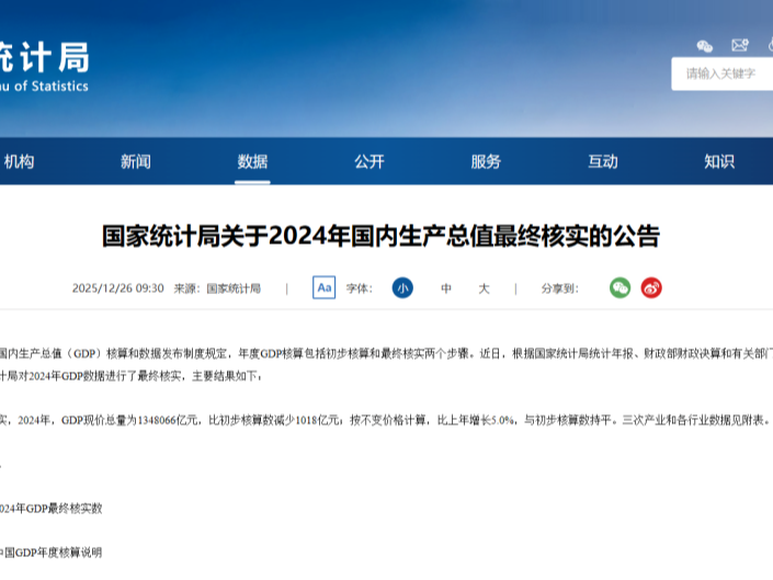 国家统计局:经最终核实,2024年GDP现价总量为1348066亿元